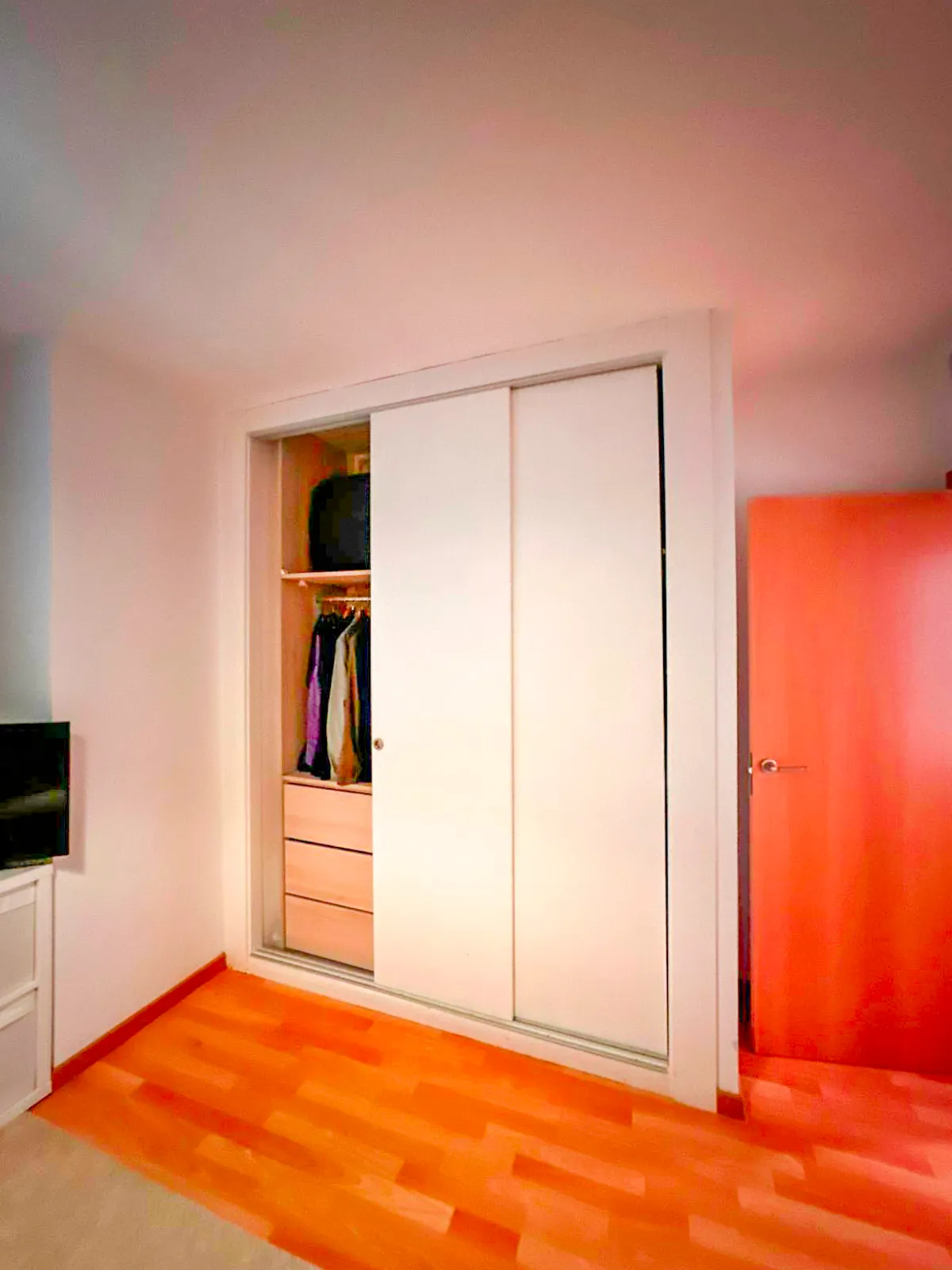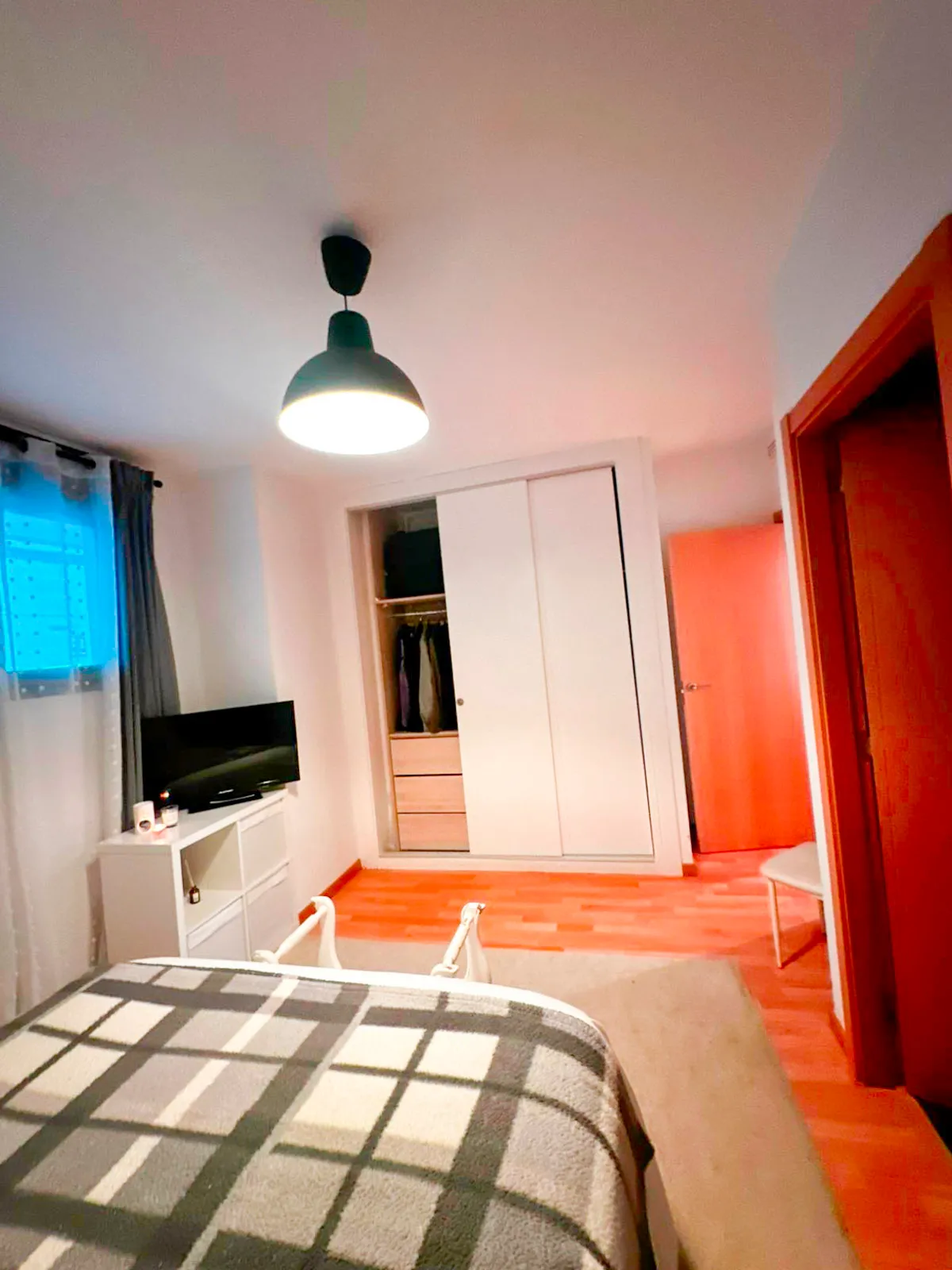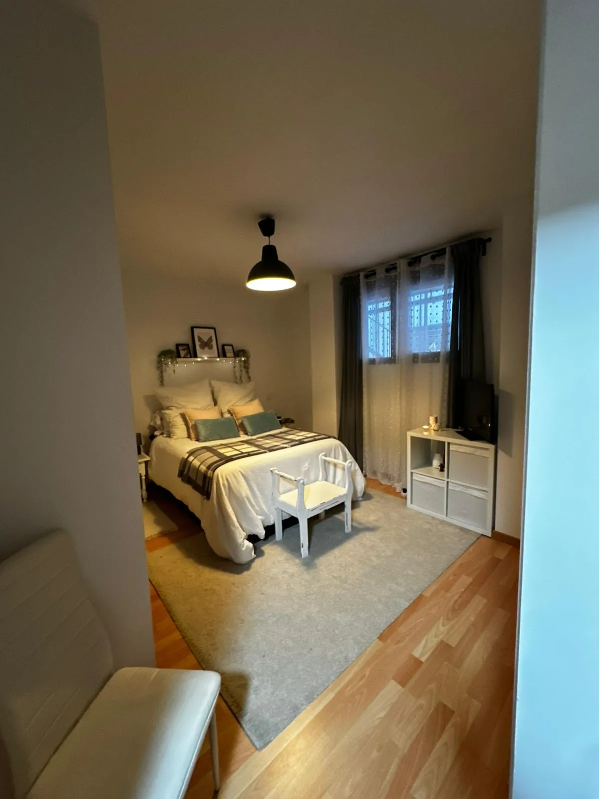 Entras y lo primero que nota es que esto no parece un piso de segunda mano estándar. Tarima flotante, carpintería interior blanca lacada, iluminación empotrada, molduras en el techo. El salón tiene aire acondicionado con bomba de calor — frío en verano, calor en invierno — y da directo a una terraza de 26 metros que funciona como una estancia más durante prácticamente todo el año.