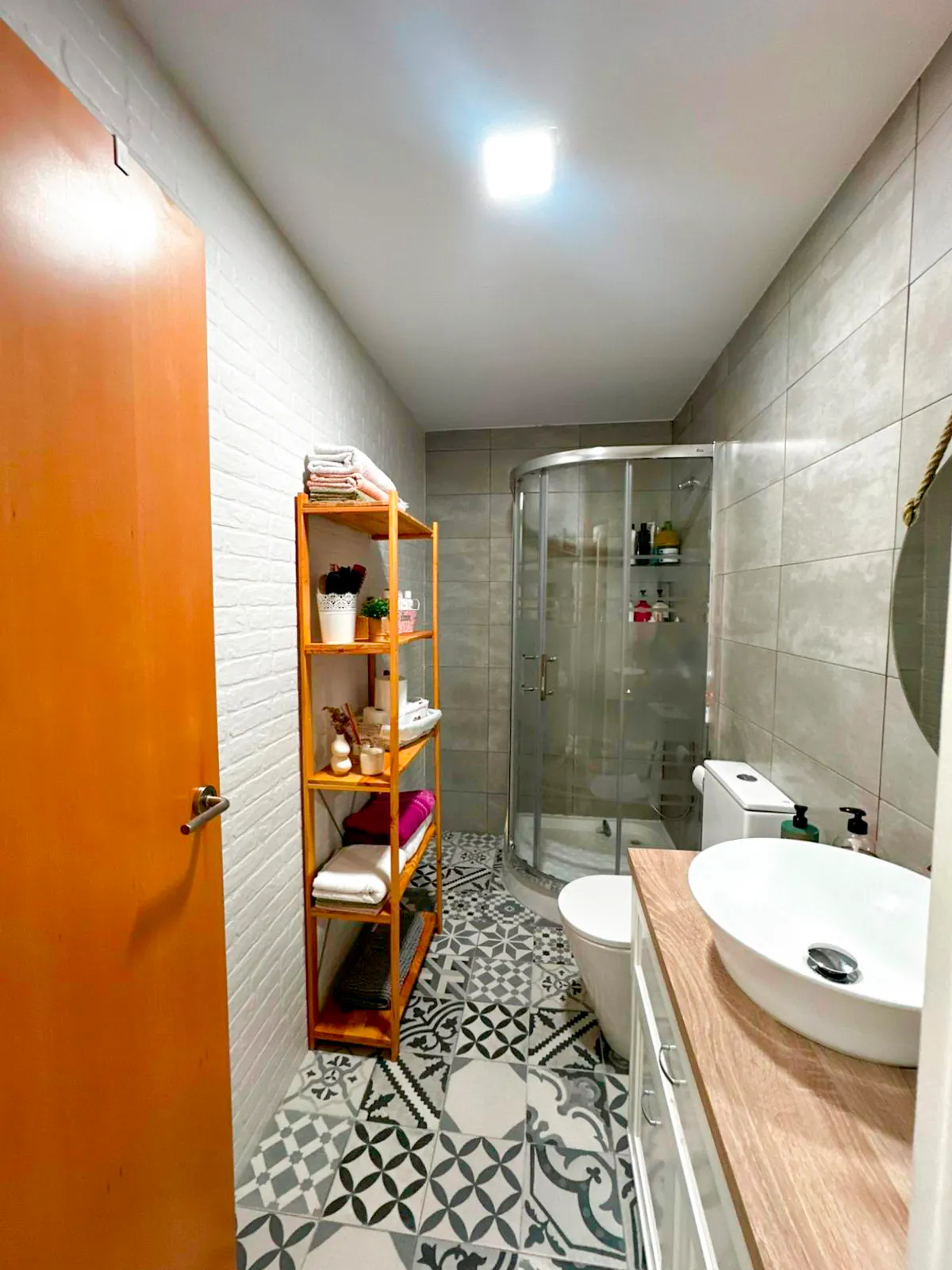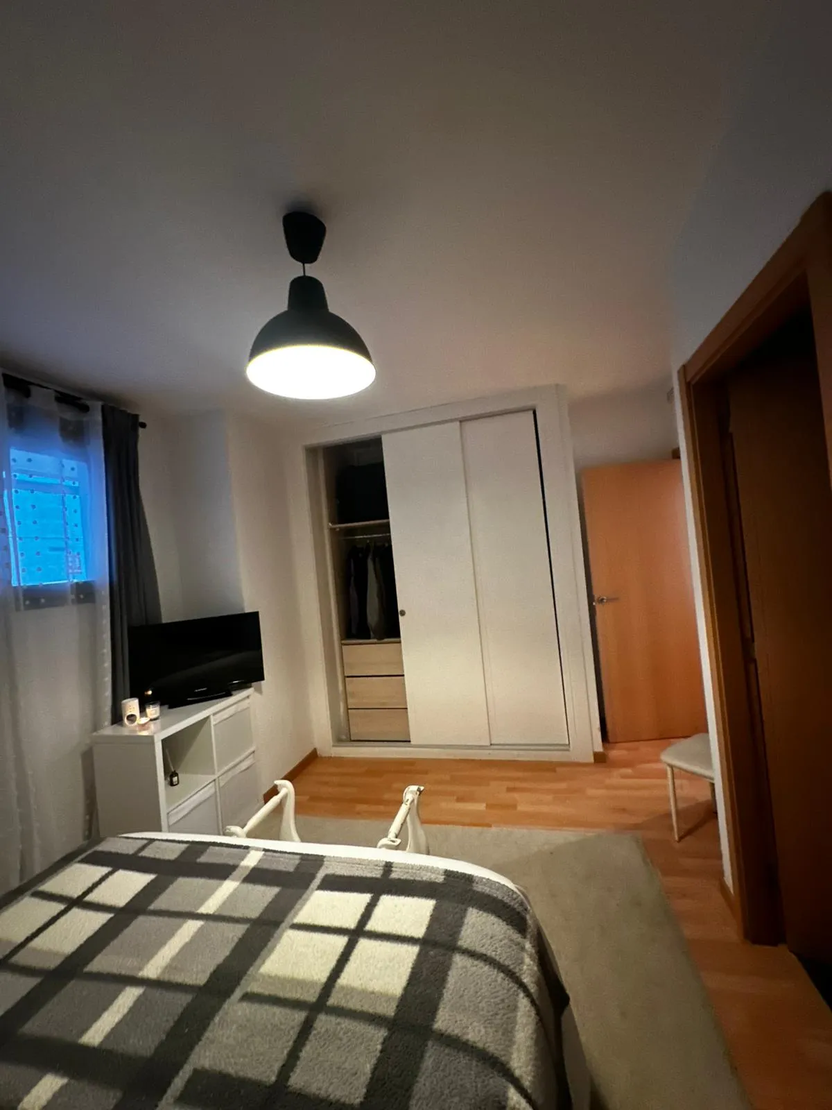 Las tres habitaciones están bien dimensionadas. La principal es suite: armario empotrado de suelo a techo, aire acondicionado propio y baño incorporado con plato de ducha y mampara de cristal. Para los demás, hay un segundo baño completo con bañera. La cocina tiene muebles blancos, encimera en L, vitrocerámica, horno y microondas integrados — lista para usar desde el primer día.